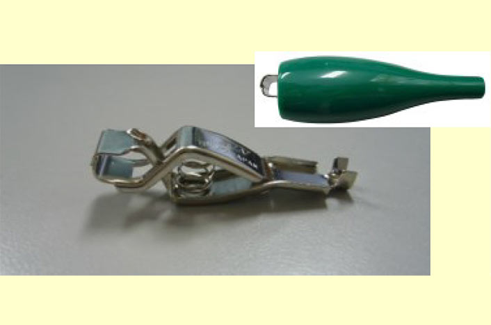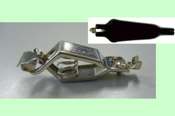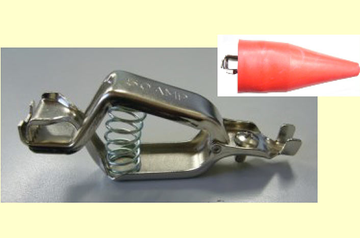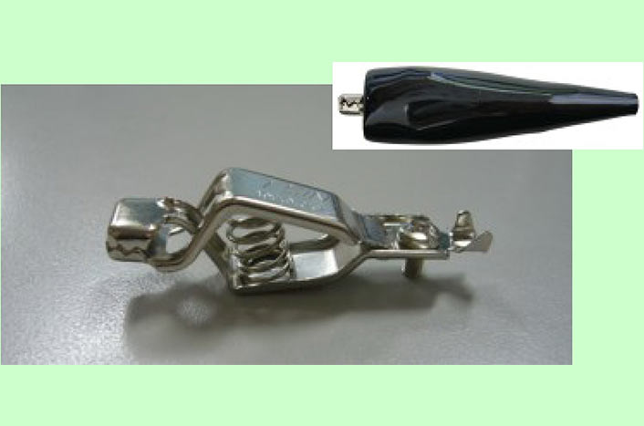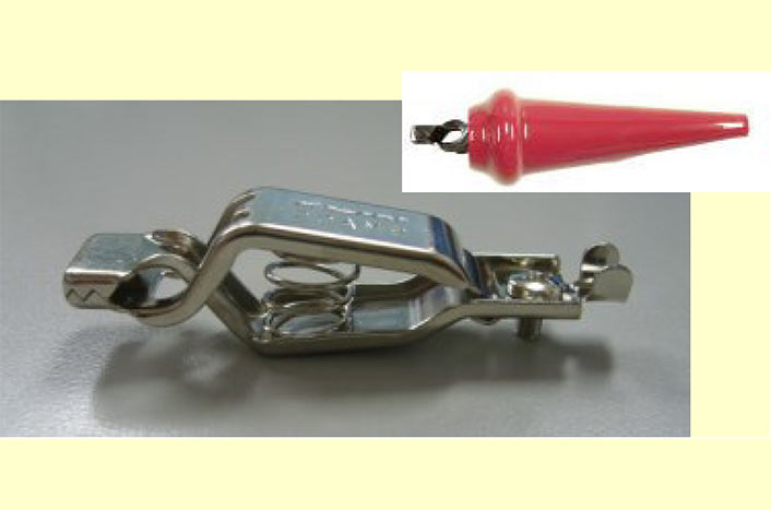端子やリード線を鋸歯状クリップで挟んで接続し、バネ式つまみ部は絶縁体で被せてあり安全な接続を可能